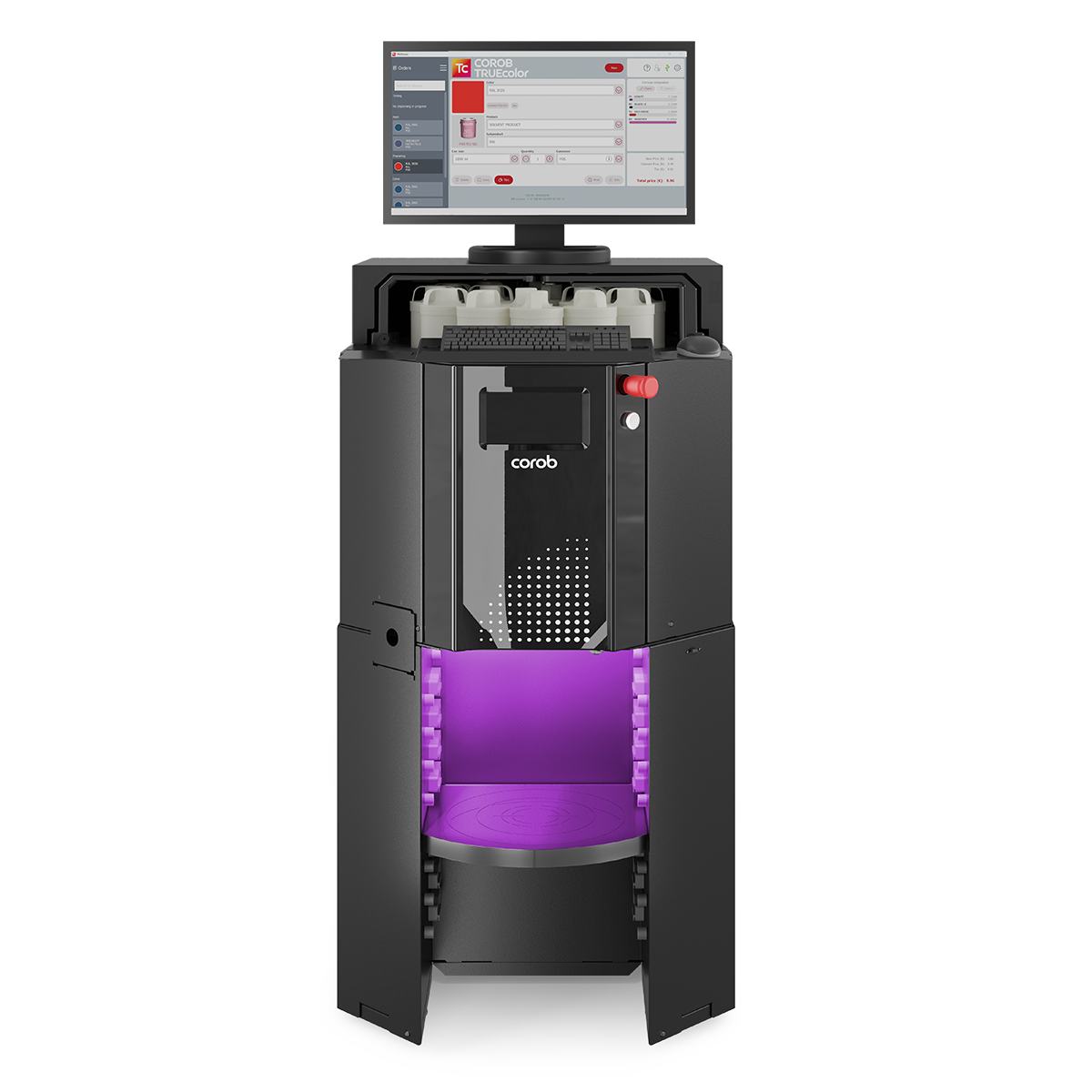 The T200 turntable paint dispenser sets a new benchmark for in-store tinting performance, accommodating large 4.3-liter canisters while maintaining an ultra-compact footprint. Designed for retail environments with medium to low productivity needs, its 0.5 L/min flow rate ensures efficient dispensing.